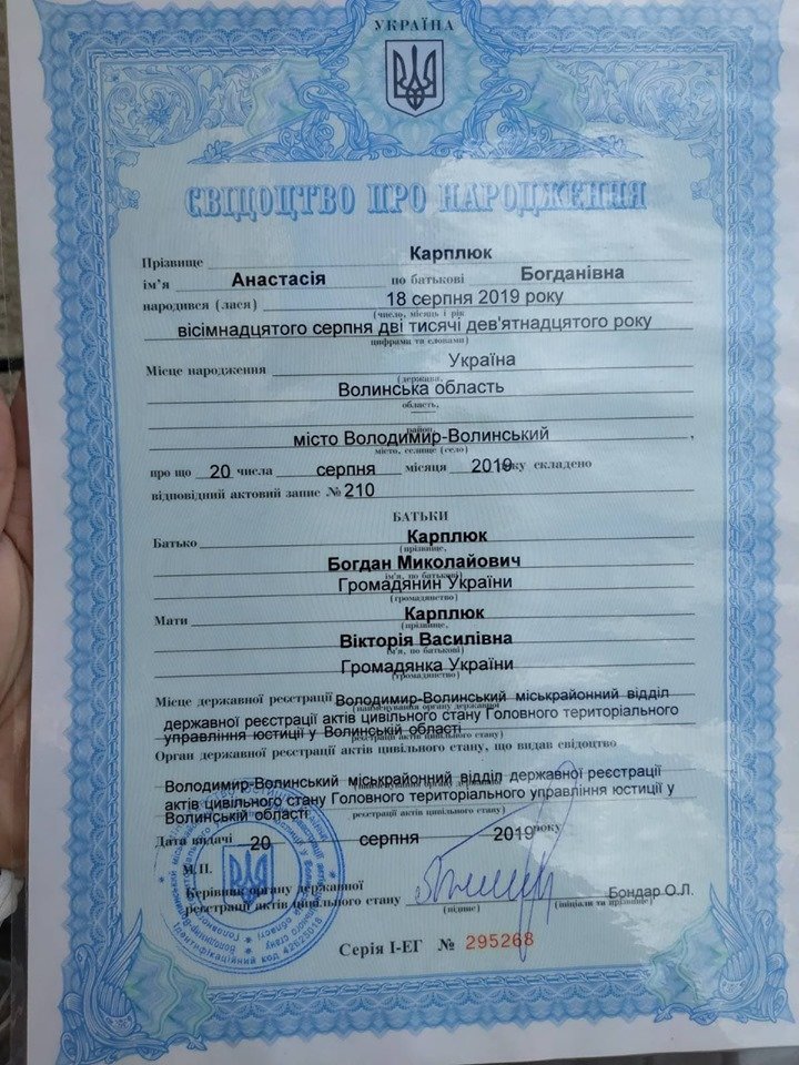 Анастасійка Карплюк народилася у Володимирі-Волинському 18 серпня 2019 року.