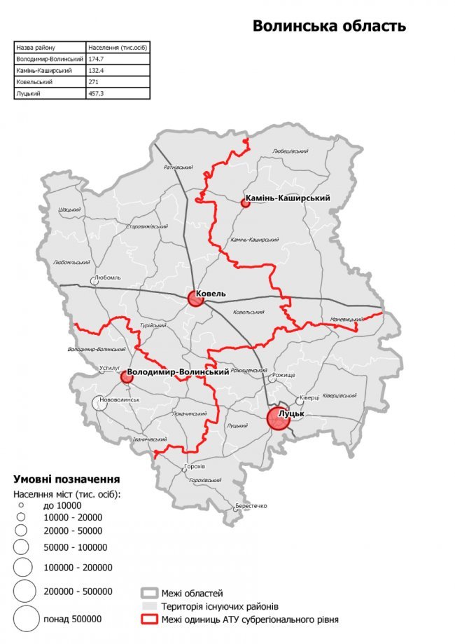 Згідно з документом, у Волинській області буде 4 райони: Володимир-Волинський, Камінь-Каширський, Ковельський, Луцький.