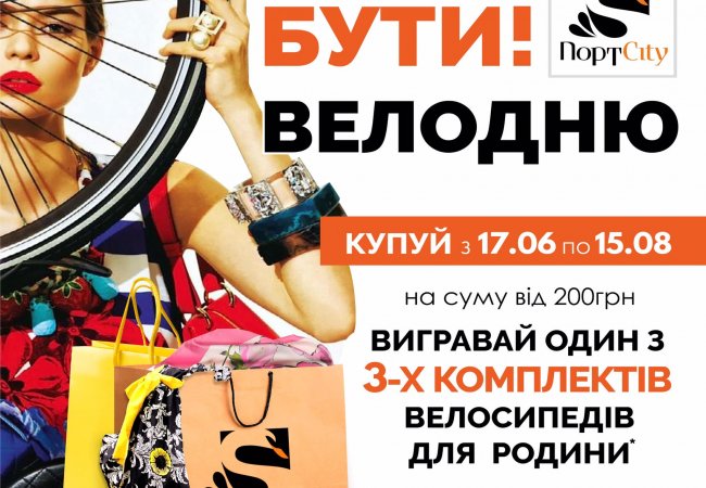 Щоб взяти участь у розіграші 3-х комплектів велосипедів для родин, потрібно з 17 червня по 15 серпня робити покупки у магазинах та закладах, що знаходяться на території ТРЦ ПортCity (окрім гіпермаркету “Там Там Сімейні традиції”) єдиним чеком на суму від 200 гривень, вказувати своє прізвище, ім’я та номер телефону на звороті чеку та опускати його у лототрон, що знаходиться у холі на 1-му поверсі ТРЦ.