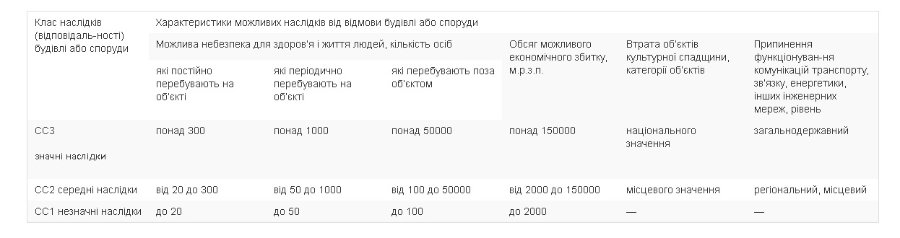 В Україні діє категоризація складності об’єктів будівництва. Клас наслідків (відповідальності) будівлі або споруди визначається відповідно до п. 5.1 чинного ДБН В.1.2-14-2009 «Загальні принципи забезпечення надійності та конструктивної безпеки будівель, споруд, будівельних конструкцій та основ».