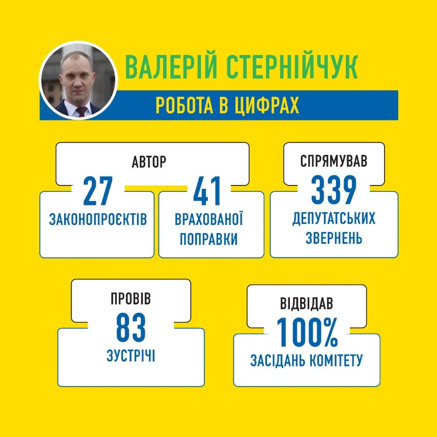 Народний депутат України Валерій Стернійчук, обраний до складу парламенту за списками політичної партії «Слуга народу», прозвітував у соцмережах про підсумки роботи впродовж року діяльності Верховної Ради України 9-го скликання.