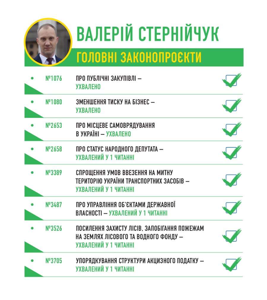 Валерій Стернійчук стверджує, що за цей рік системність, відповідальність і «турборежим» дозволили запустити механізм прийняття важливих законодавчих змін, серед яких виділяє: