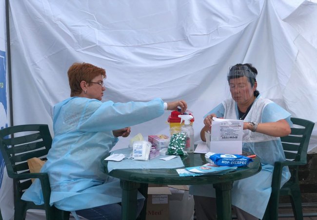 Намет, де працюють двоє медиків, які роблять експрес-тести, стоїть на Театральному майдані із 11:30 ранку. Буквально за декілька хвилин зібралася черга із охочих перевіритися.