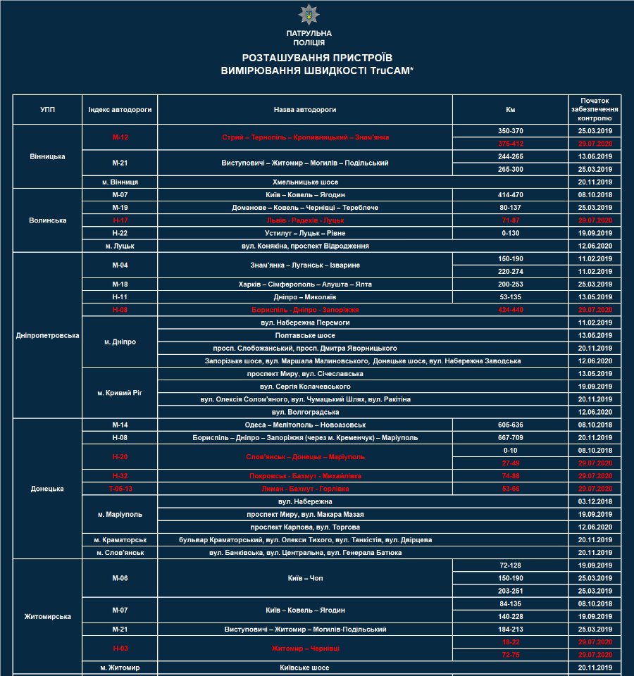 Кількість ділянок, на яких патрульні вимірюватимуть швидкість за допомогою приладу TruCAM — збільшується. Від 29 липня швидкісний режим почали контролювати на трасі Н-17 "Львів-Радехів-Луцьк".