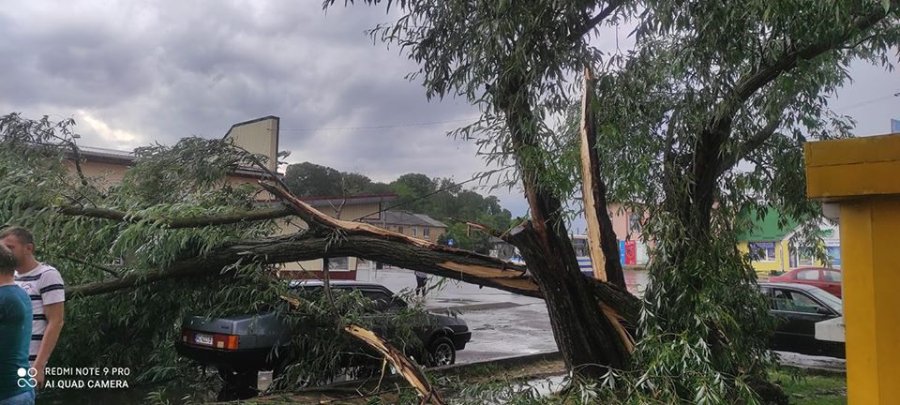 У коментарях до допису користувачі діляться світлинами наслідків сильної грози у Горохові. Вікторія Демченко показала фото, як біля автостанції внаслідок шквального вітру дерево розкололося на декілька частин та одна його половина впала на автомобіль.