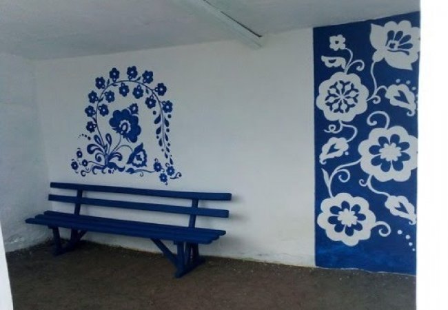 Жінка розповіла, що її охоче підтримали й інші односельці. Якщо раніше тут були сонечко з промінчиками, дитячі долоньки та інші більш дитячі малюнки, бо залучали молодших школярів, то нині споруда виглядає ще привабливіше. Вона витримана в білому та синьому кольорах, орнамент нагадує Петриківський розпис.