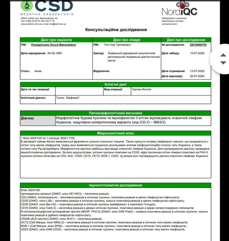 Вчора, 29 липня, Ольга дізналася свій діагноз – лімфома Ходжкіна (злоякісна пухлина лімфатичної системи). Хвороба дуже швидко розвивається.