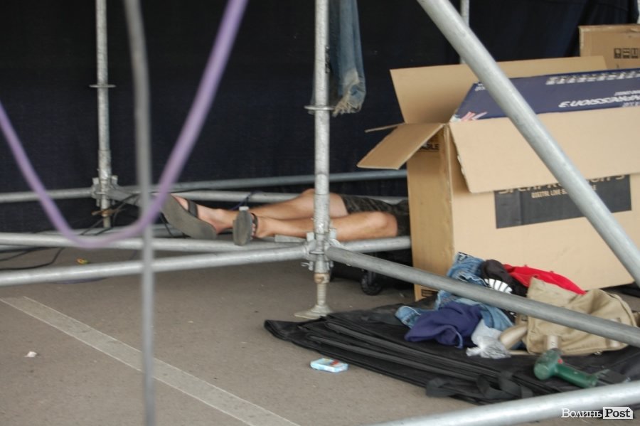Сценічне обладнання налаштовувала фірма зі Львова. Хлопці дуже втомилися і відпочивають просто під сценою, поки там відбуваються саунд-чеки. Залізні нерви :)