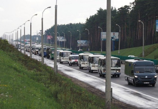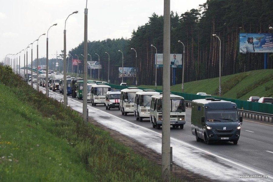 Також у мережі публікують фото, на яких видно, як до столиці Білорусі з’їжджаються колони з військових вантажівок, автобусів з особовим складом, автозаків, водометів. На фото можна побачити і причепи з колючим дротом.