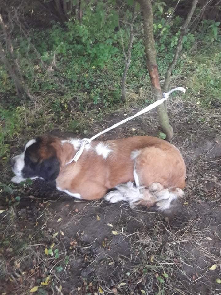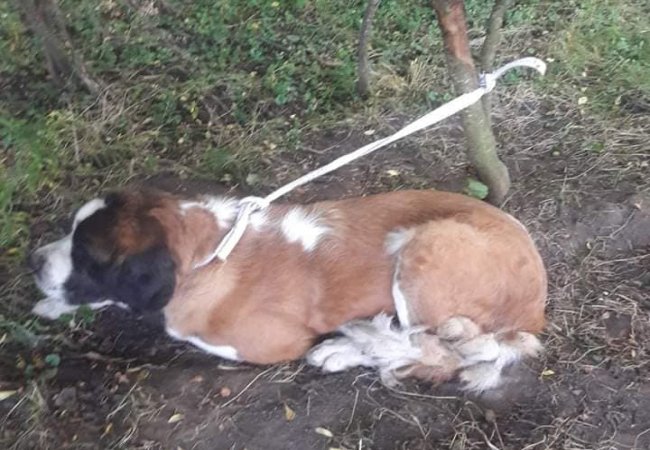"Сьогодні, коло села Лаврів, в лісі було знайдено немолоду собаку, яку нелюд прив’язав до дерева. Собака дуже худа та зневоднення.