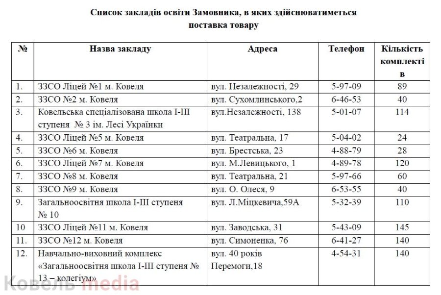 Участь у торгах взяли ТОВ «Нікан груп» (м. Вінниця), Рівненське НВП УТОГ, приватна підприємиця Наталія Чимрук (с. Воля-Ковельська) та ТОВ «Компанія «Гамаюн» (м. Київ). Перемогу здобула вінницька фірма, основний вид діяльності якої – оптова торгівля меблями, килимами й освітлювальними приладами, яка запропонувала найменшу ціну за нові шкільні меблі – 986 580 гривень.
