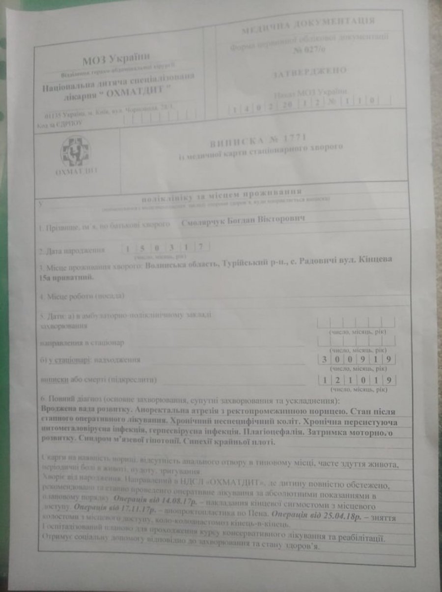Біда спіткала малюка від самого народження. Лікарі поставили невтішний діагноз: вроджена вада розвитку. Аноректальна атрезія з ректопромежинною норицею. Хронічний неспецифічний коліт. Сім'я Смолярчуків уклінно просить всіх, хто має змогу, допомогти їхньому синові поборотися за здорове життя.
