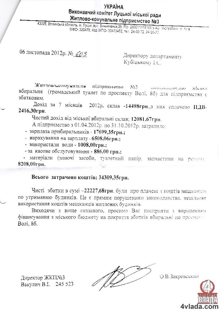 "Чисті збитки в сумі – 22227,68 грн. були проплачені з коштів мешканців по утриманню будинків. Це є прямим порушенням законодавства, нецільове використання коштів мешканців житлових будинків. Виходячи з вище сказаного, просимо Вас посприяти з вирішенням фінансування з міського бюджету на покриття збитків вбиральні по проспекті Волі, 8б", - йдеться у тексті довідки.