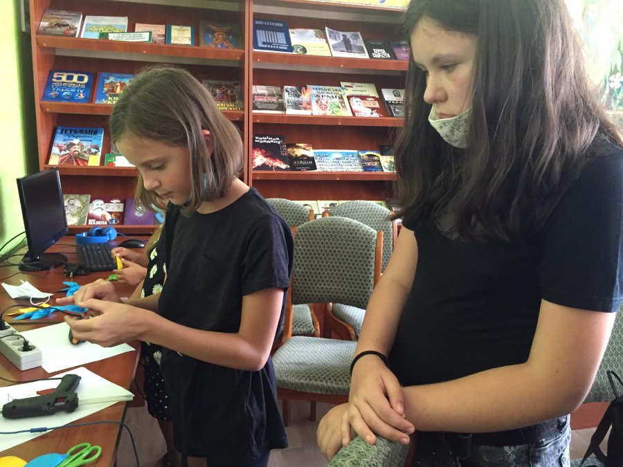 Жовто-блакитні вироби своїми руками створювали юні відвідувачі бібліотеки, які навчаються у різних школах міста. Діти підійшли до завдання дуже відповідально і менш ніж за годину підготували гарні сувеніри, а також написали вітання захисникам.
