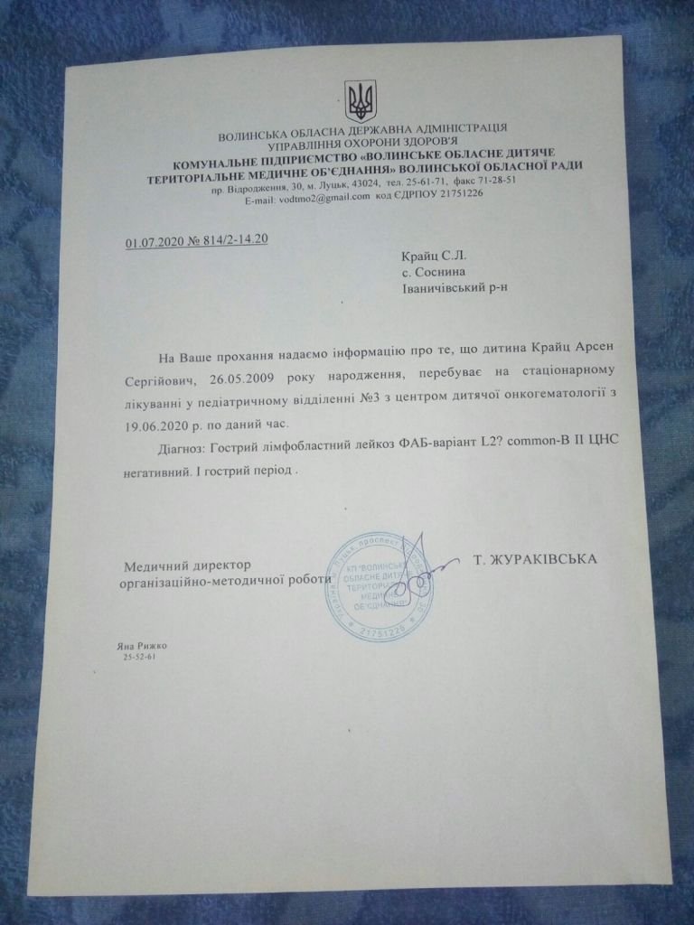 Мешканець села Соснина Іваничівського району 10-річний Арсен Крайц важко хворіє. У травні в хлопчика діагностували онкозахворювання – гострий лімфобластичний лейкоз.