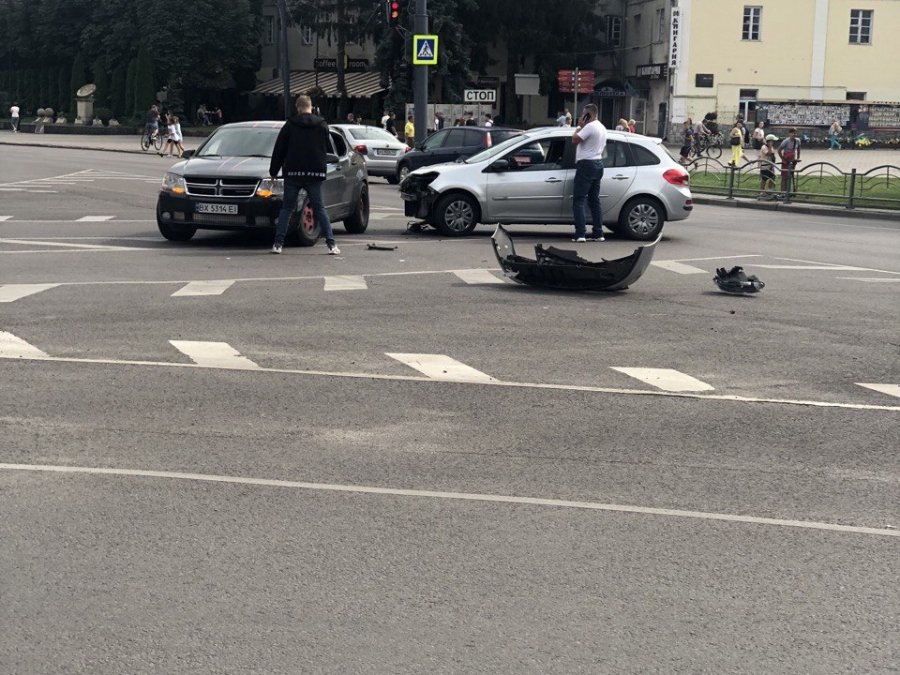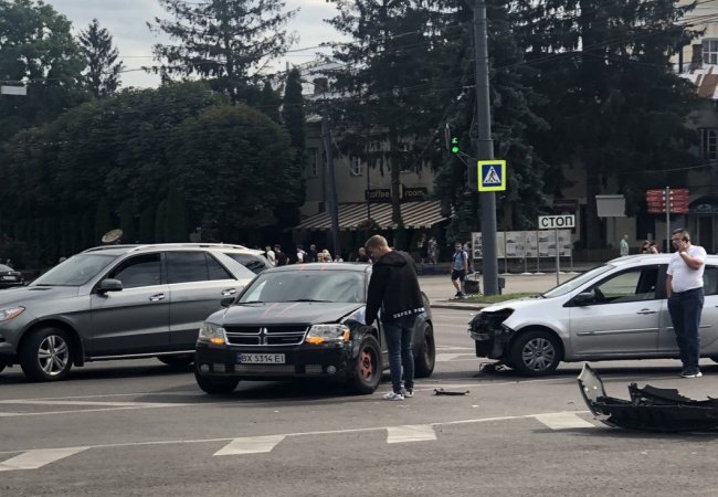 Так, сьогодні, 26 серпня, близько 15 години біля ЦУМу не розминулися два автомобілі – чорний Dodge і сірий Renault.