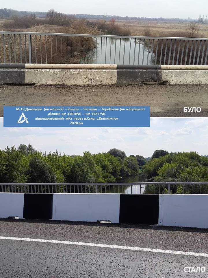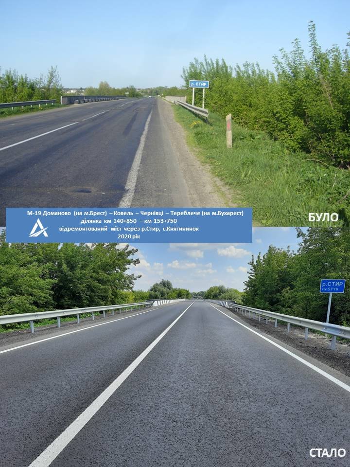 У рамках поточного середнього ремонту автошляху М-19 Доманово (на м. Брест) – Ковель – Чернівці – Тереблече (на м. Бухарест) на ділянці км 140+850 – км 147+050 завершили відновлення мосту через річку Стир у селі Княгининок Луцького району, довжиною майже 90 метрів.