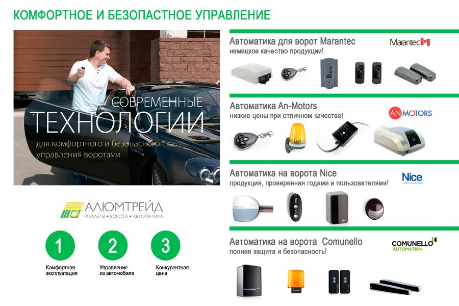 Великий вибір товарів з даної серії можна знайти в компанії «АЛЮМТРЕЙД». В її асортименті представлена продукція ТМ Алютех. Вона випустила дві серії воріт під назвою Trend і Prestige. Їх головна відмінність один від одного полягає в товщині застосованих панелей. У всіх же інших параметрах вони практично ідентичні. До деяких особливостей пропозицій з каталогу можна віднести: