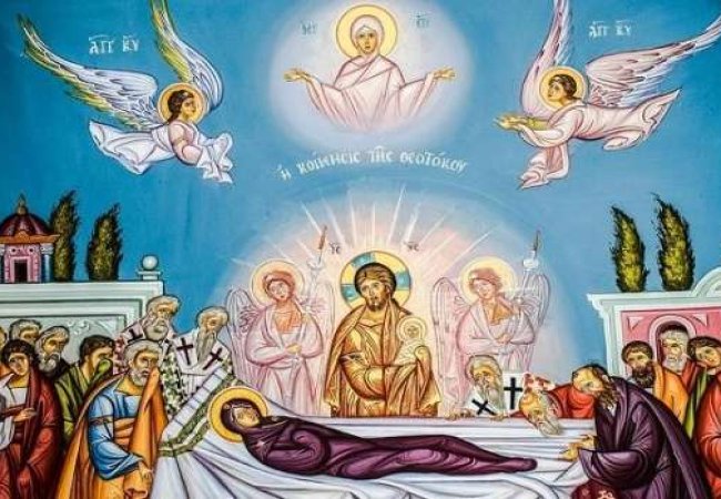Згідно з церковним переданням, в день, коли Богоматір мала відійти у вічність, апостоли залишили місця своєї проповіді та дивним чином зібрались в Єрусалимі, щоб попрощатись з Пресвятою Богородицею та здійснити погребіння її пречистого тіла. Перебуваючи навколо її ложа, вони були засліплені яскравим світлом, в якому явився Христос в оточенні ангелів та архангелів. У цей момент чиста душа Діви Марії без страждання, ніби уві сні, відійшла до Господа. Іконографічна традиція свята розповідає, що Богородиця віддала свою чисту душу в руки свого Сина і Господа Ісуса Христа, а в цей час з небес лунали звуки ангельських хорів.