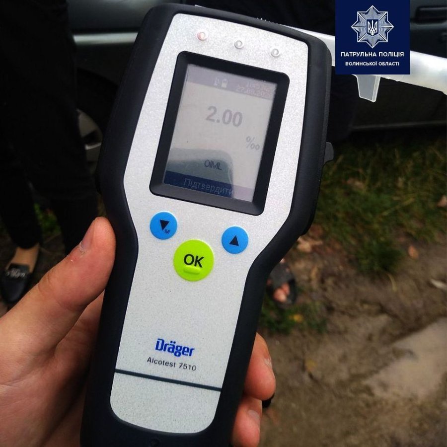 Проходження огляду на стан сп’яніння на місці пригоди на приладі Dräger показав результат у 2.00 проміле, що в 10 разів перевищує норму, пише патрульна поліція у Волинській області.