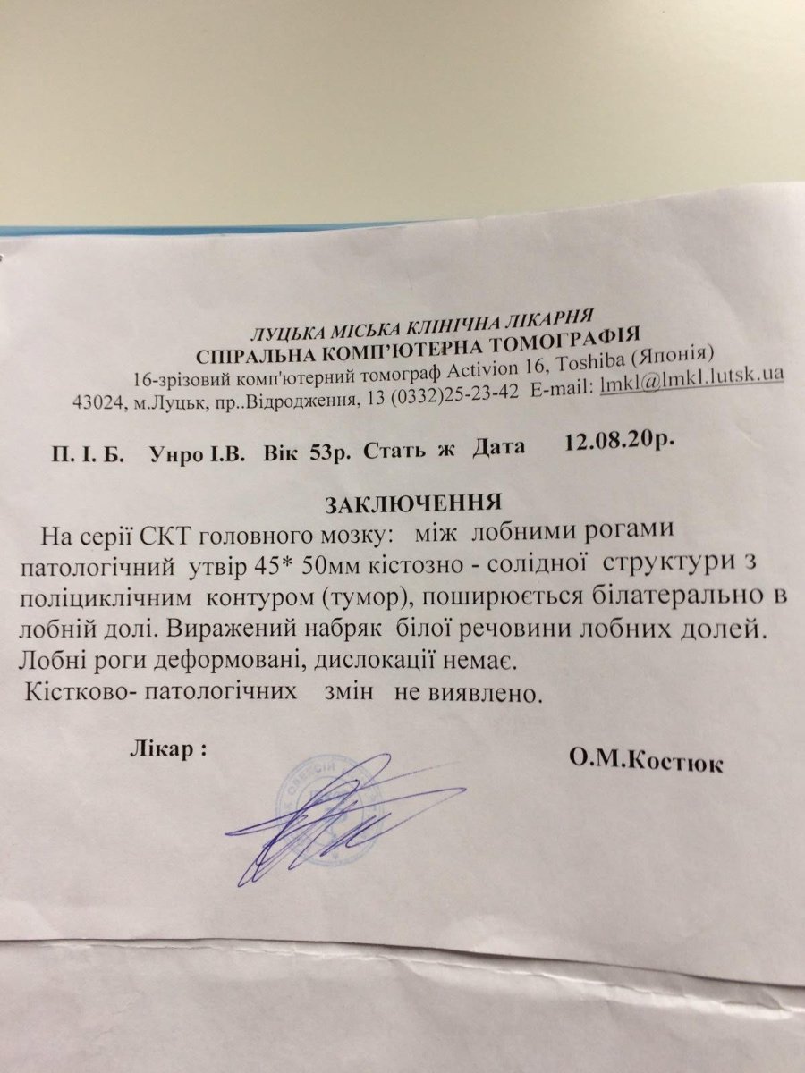 Унро Ірині Вадимівній – 53 роки, жінка – колишній педагог третьої музичної школи міста Луцьк, яка зараз бореться зі страшною хворобою – двосторонньою пухлиною головного мозку та аденомою щитової залози. Вона втратила роботу і залишилась повністю без засобів існування, тож просить усіх небайдужих про допомогу.