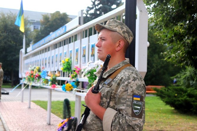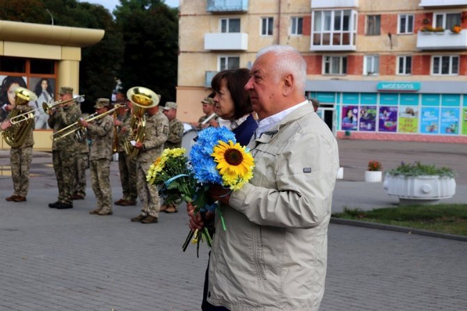 Захід розпочався із Державного Гімну біля дошки Пам’яті загиблих у зоні проведення АТО (ОСС) військовослужбовців, який присутні заспівали під акомпанемент військового оркестру 14-ої окремої механізованої бригади імені князя Романа Великого.