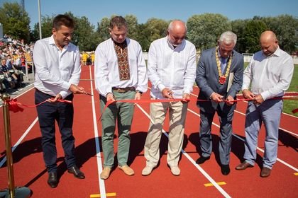 Міський голова Віктор Сапожніков разом із гостями перерізали стрічку оновленого стадіону імені сестер Абашидзе-уродженок Нововолинська, майстрів спорту Міжнародного класу з легкої атлетики.