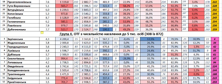 Крім того, в групі об’єднаних територіальних громад з чисельністю до 5 тис. осіб (308 із 872) 4 місце у загальноукраїнському рейтингу займає Зарічанська сільська ОТГ Володимир-Волинського району. Натомість у цій же групі Війницька сільська ОТГ Локачинського району та Велицька сільська ОТГ Ковельського району займають 290 та 295 місця.