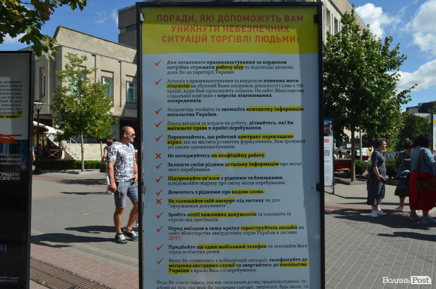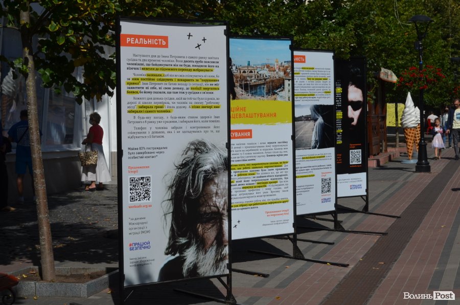 На фотостендах знайшли відображення історії постраждалих українців, які в пошуках кращого життя приймали пропозиції, подекуди, ненадійних роботодавців і потрапляли до небезпечних ситуацій.