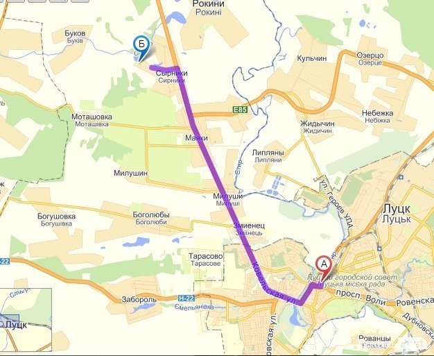 YandexMap стверджує, що від центру Луцька до ставка їхати машиною 15 хв, протяжність маршруту - 12 км