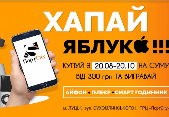 У ТРЦ "ПортCity" розігрують айфон, плеєр і смарт-годинник.