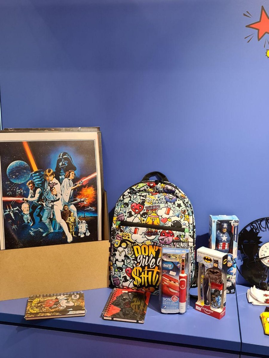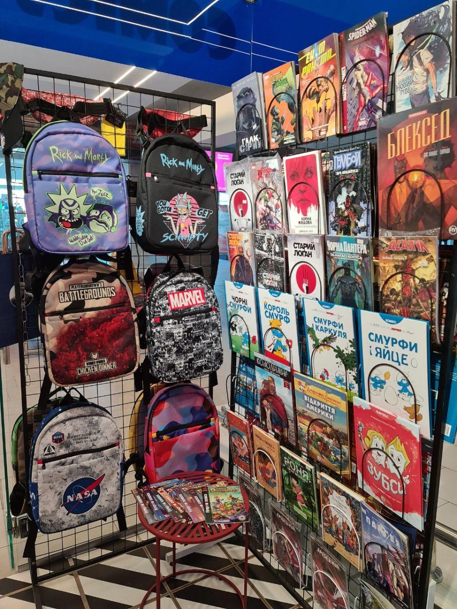 В асортименті є комікси та тематичні речі для дітей та дорослих: рюкзаки, бананки, кепки, шкарпетки, дитячі книжечки, годинники та інше.