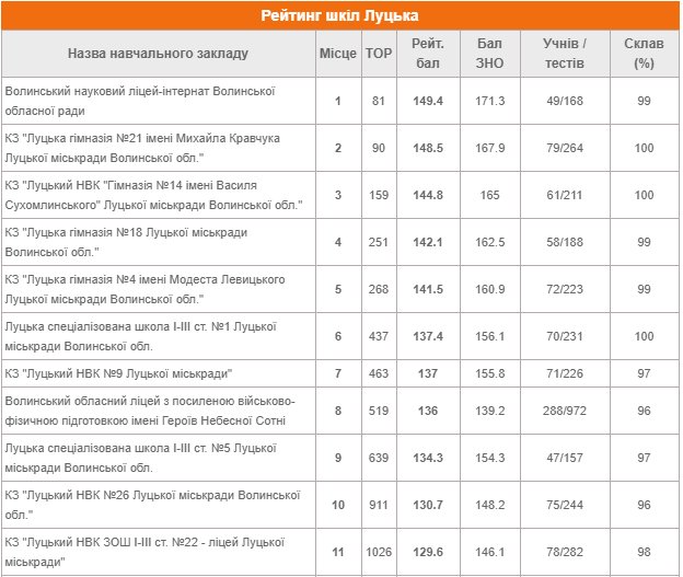 Рейтинг шкіл Луцька за результатами ЗНО-2020