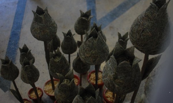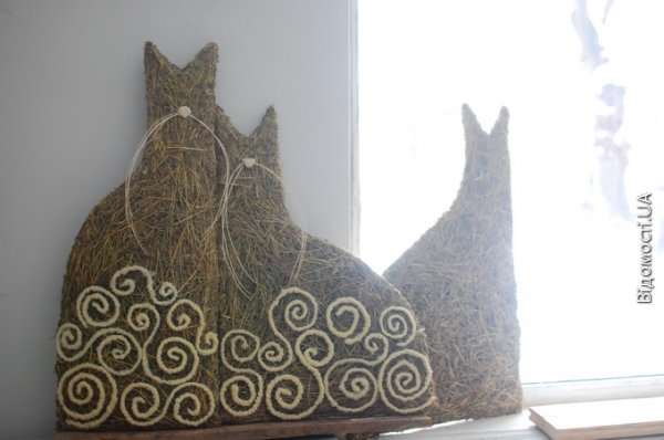 Усі вироби виготовлені виключно із сіна, адже, за словами флористки, цей матеріал в українців є символом добробуту. В давнину, якщо когось з членів родини проводжали у далеку дорогу, то слід за ним посипали саме сіном.