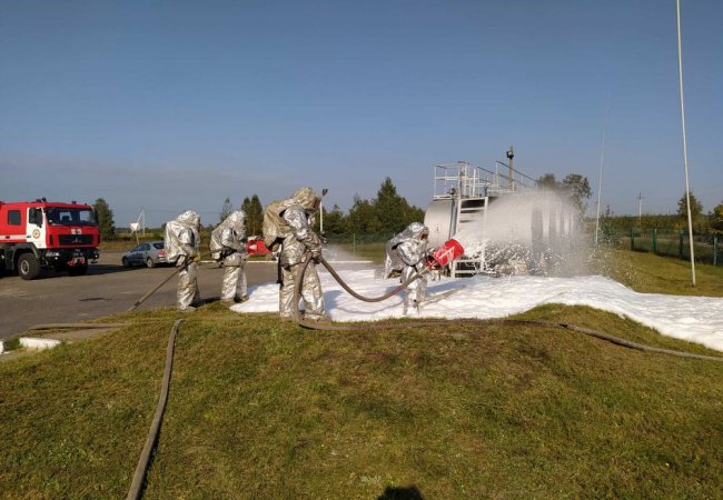 Рятувальники 12-ї Державної пожежно-рятувальної частини смт Любешів Управління ДСНС у Волинській області прибули до місця події в складі двох відділень, включились в апарати на стисненому повітрі та провели бойове розгортання. Для подачі на гасіння пожежі пального рятувальники одягнули тепловідбивні костюми. Завдяки правильному порядку застосування сил і засобів умовна пожежа була успішно ліквідована.