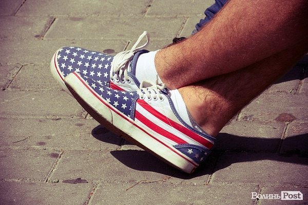 Короткі джинсові шорти, типові для Америки 80-х років, кеди, розмальовані у національний американський прапор, кепка Chicago Bulls, тигрова майка і годинник радянського виробництва.