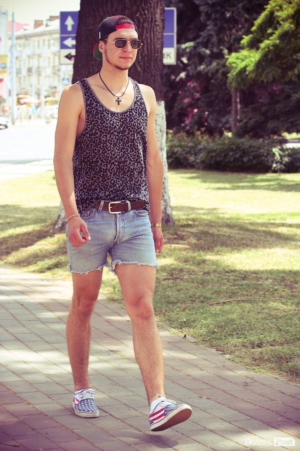 Такий одяг людина зі здоровим глуздом ніколи на одіне.. Гуманітарні шорти незрозумілі, якась розтягнута майка, і годинник який на "Старому ринку коштує 10-30 грн., і він каже шо він модель. Йому В АРМІЮ треба, шоб дурню з голови трохи вибили..