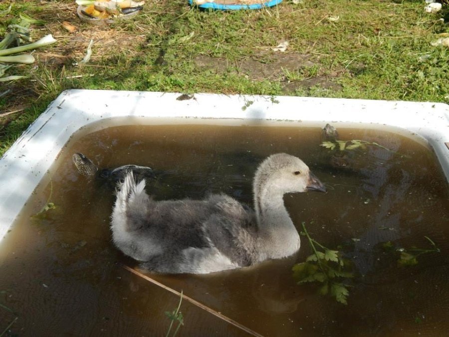 "Тут у Боні невеликий басейн. Приймає водні процедури разом із черепашками. Наше гусенятко дуже любить відвідувачів. Тільки бачить – поспішає назустріч, за порцією уваги) Ще трішки - і випустимо його у ставок. Там, де дорослі гуси. На фото – Боня крихітний і уже трішки підріс)))", - кажуть в звіринці.