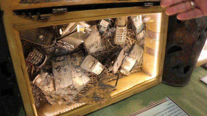 Серед експонатів є скринька з телефонами, з яких загиблі востаннє дзвонили близьким людям.