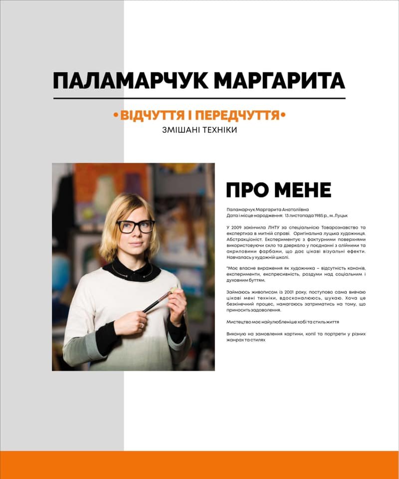 Маргарита Паламарчук – оригінальна луцька художниця, яка експерементує з фактурними поверхнями використовуючи скло та дзеркало у поєднанні з олійними та акриловими фарбами, що дає цікаві візуальні ефекти.
