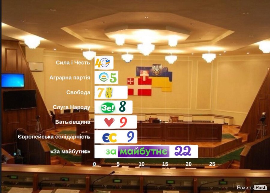 Партія «Слуга Народу» заведе до Волинської обласної ради 8 депутатів, «Свобода» – 7, «Аграрна партія України» – 5, «Сила і честь» – 4.