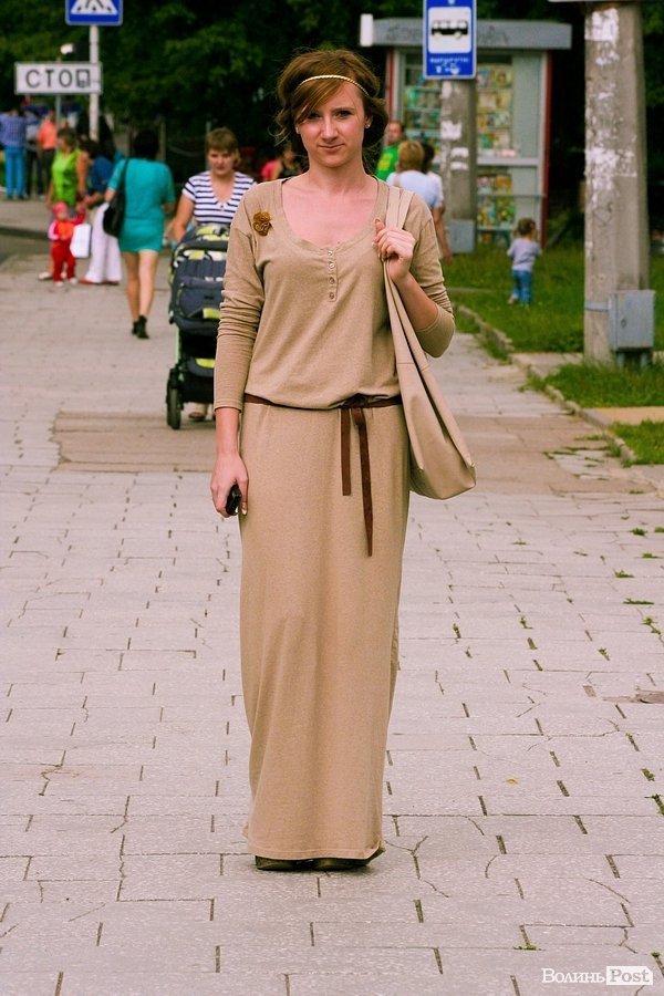 Довга однотонна сукня, яка переходить у кофту, антична зачіска з підібраним волоссям та золотавою резинкою-обручем.