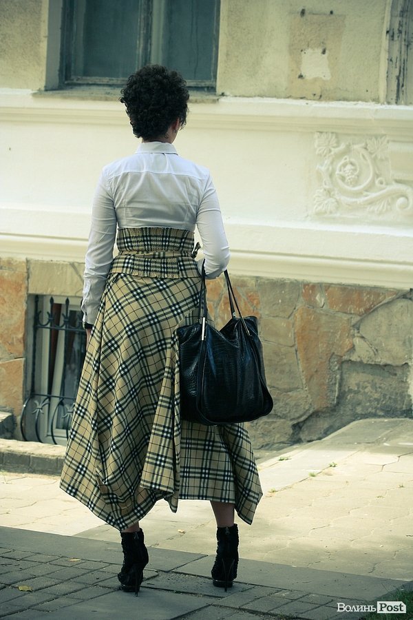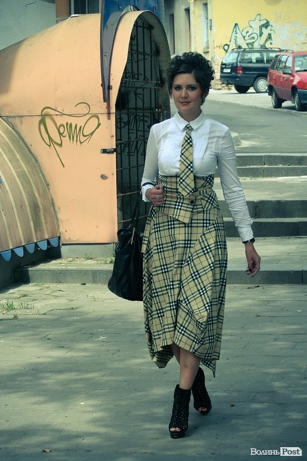 Ользі чудово вдалося витримати діловий стиль у спекотну літню пору. Офіційна біла сорочка з краваткою і сукнею у велику клітку та напівзакрите взуття на підборах. Так залюбки можна йти на роботу і виглядати стильно навіть у спекотну погоду.