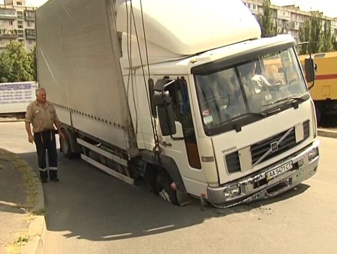 У Києві на Русанівці 5-тонна вантажівка Volvo на ходу провалилась в асфальт.