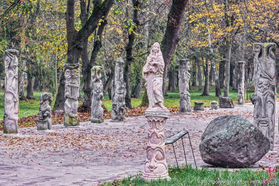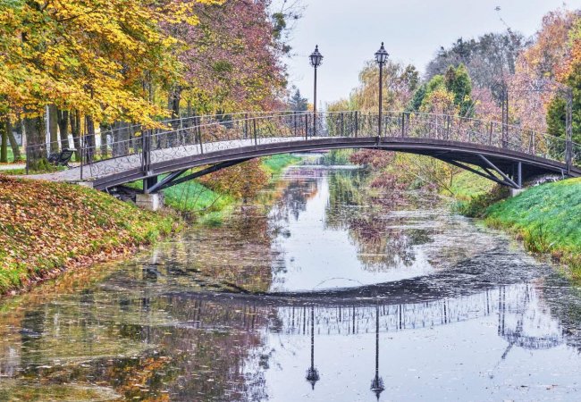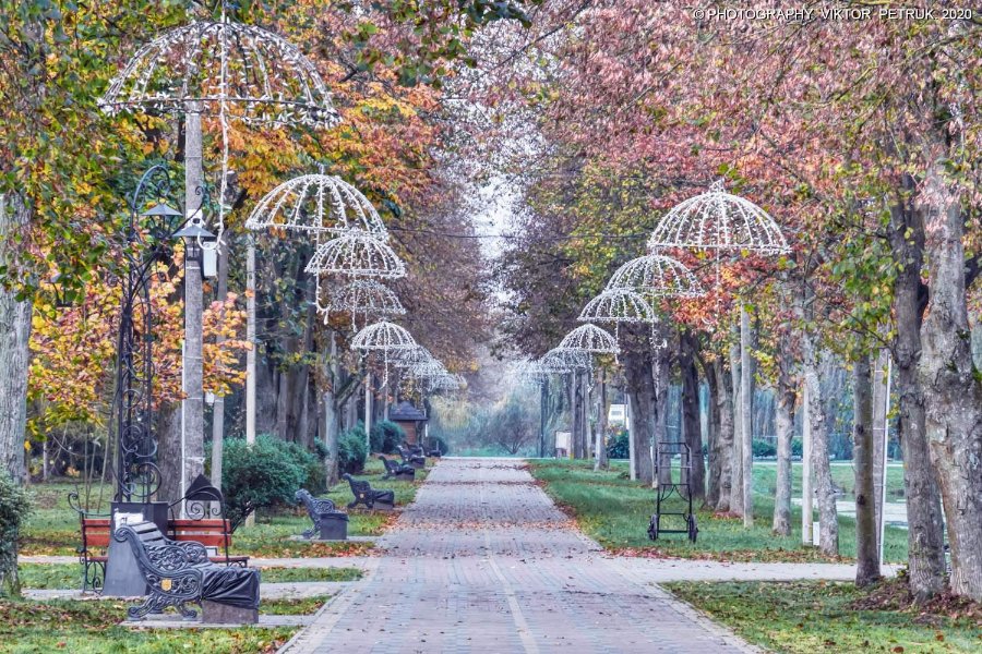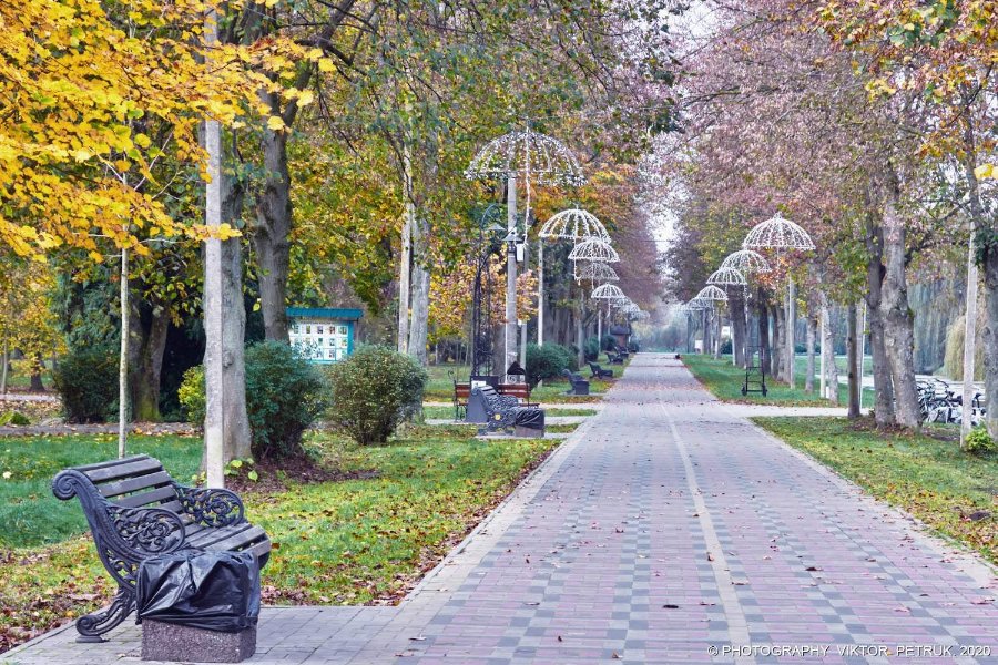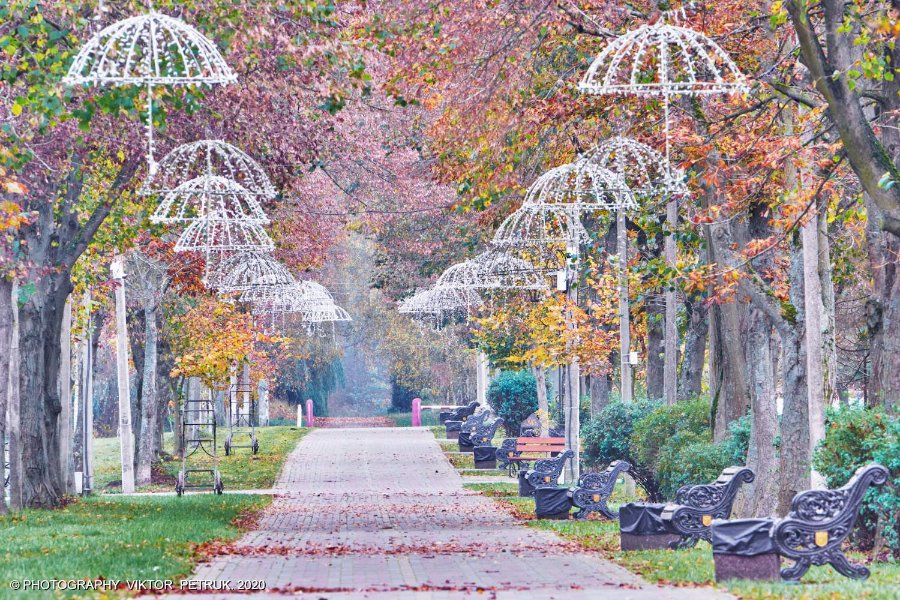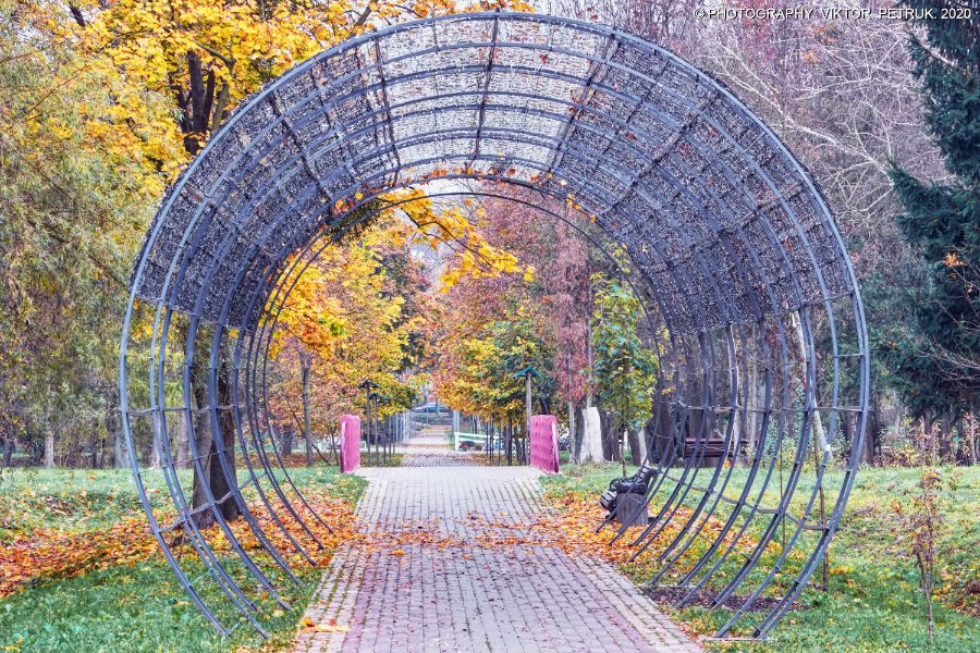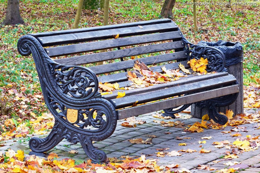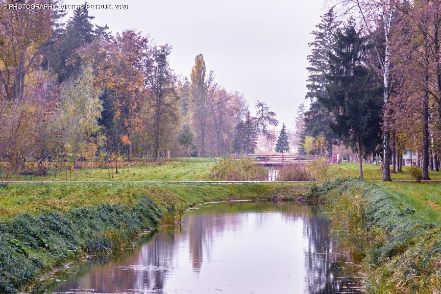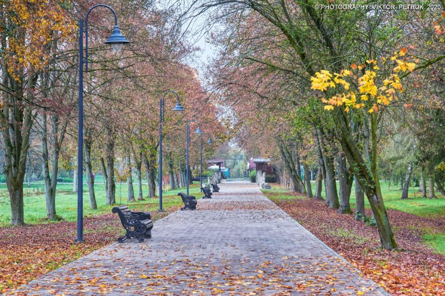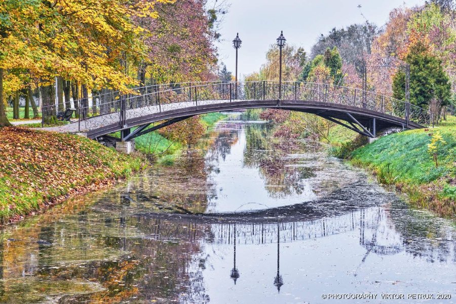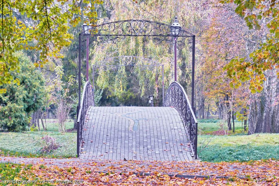 На світлинах – вкриті жовтим листям доріжки, лавки і місточки.