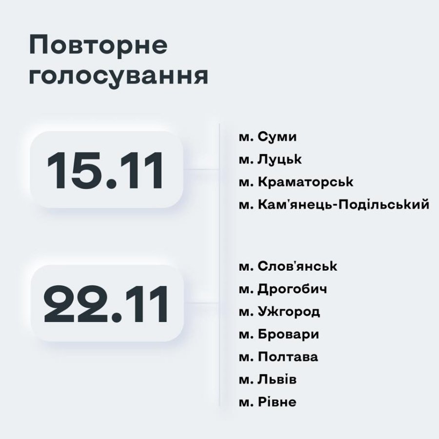 "Коли і де відбудеться повторне голосування? З інформації, яку ми отримали на сьогодні, повторне голосування уже призначили у 9-ти областях. Голосування відбудеться 15 та 22 листопада", - йдеться у дописі ЦВК.