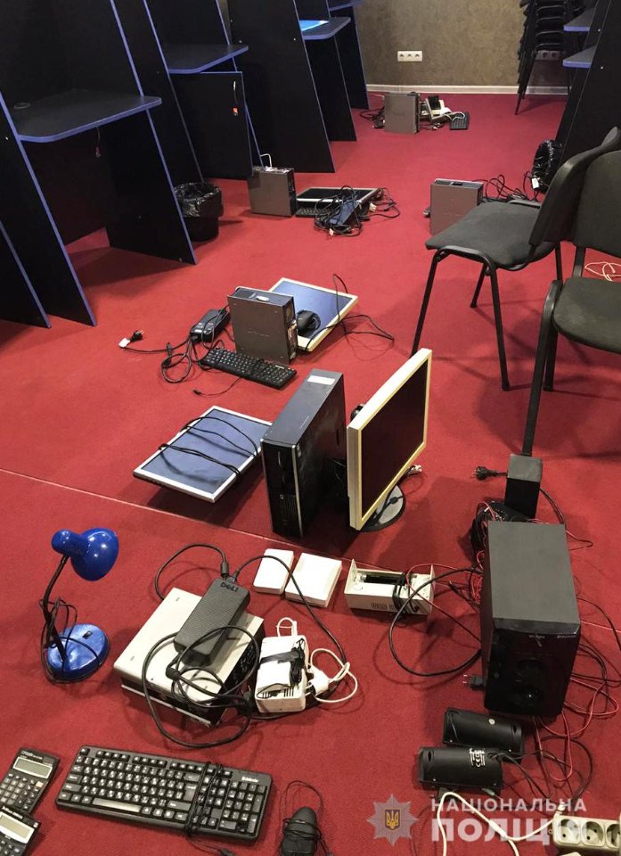Під час проведення першочергових слідчих дій поліцейські виявили та вилучили системні блоки, за допомогою яких здійснювався доступ до мережі Інтернет, флеш носії, систему відеонагляду, комплектуючі до комп’ютерної техніки, чорнові записи адміністратора та інші речові докази по справі.