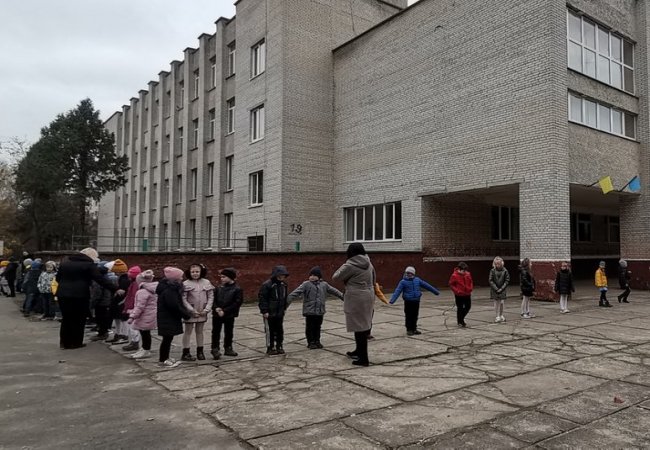 Під час руханки школярі співали та розказували вірші. Учні простояли на вулиці пів години. Педагоги їх вишиковували на відстані витягнутих рук.