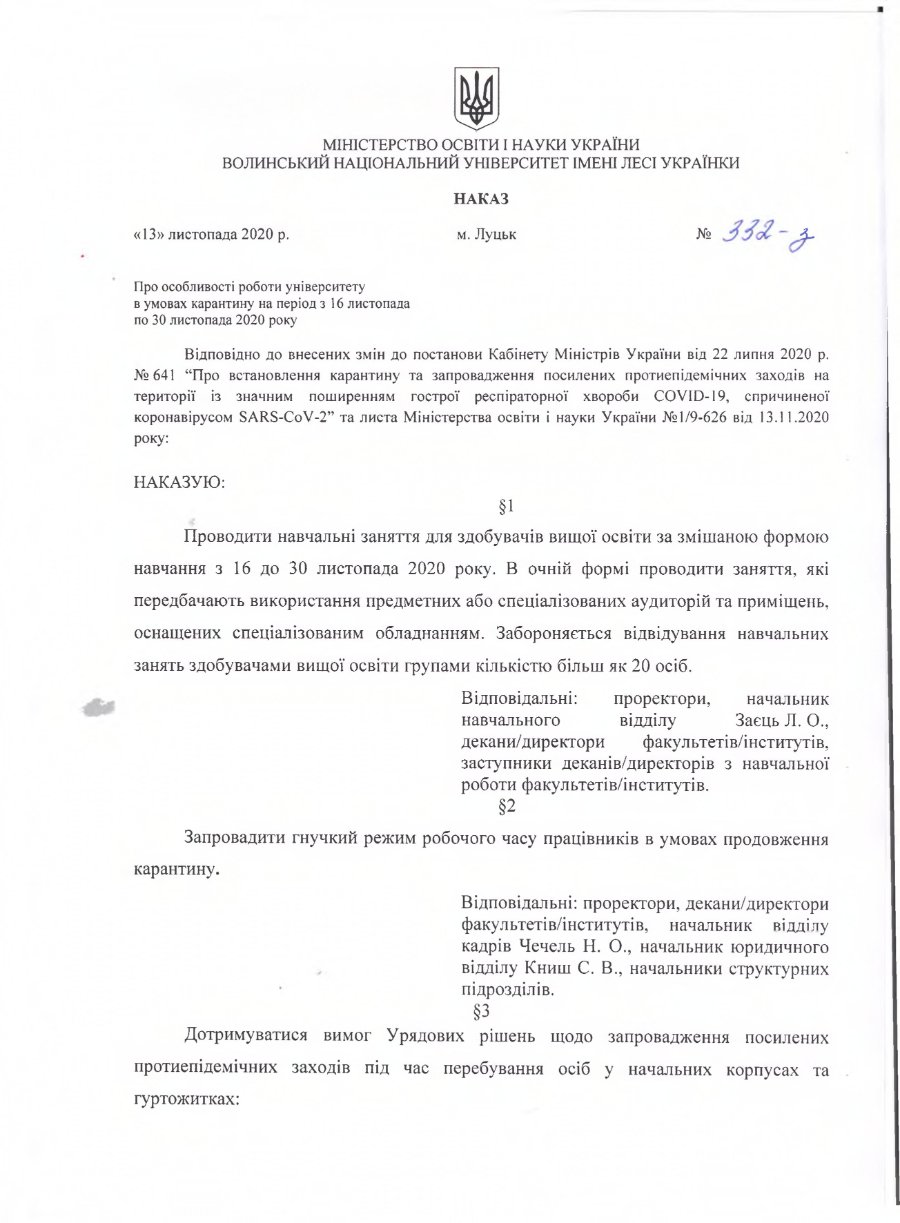 У Волинському національному університеті імені Лесі Українки з 16 листопада до ЗО листопада навчання відбуватиметься за змішаною формою.