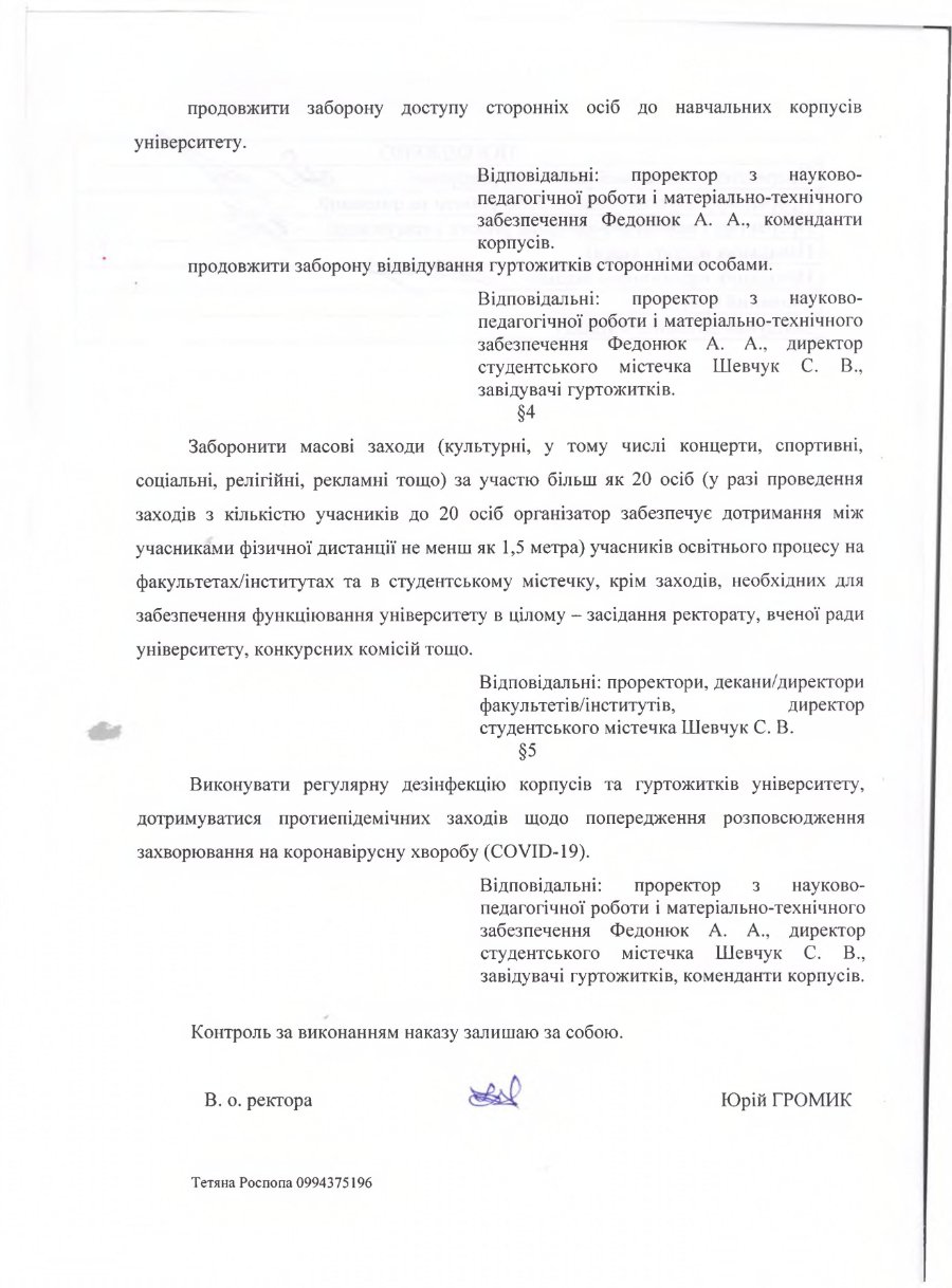 Забороняється відвідування навчальних занять здобувачами вищої освіти групами кількістю більш як 20 осіб. Також забороняється проводити масові заходи за участю більш ніж 20 осіб-учасників освітнього процесу на факультетах/інститутах.